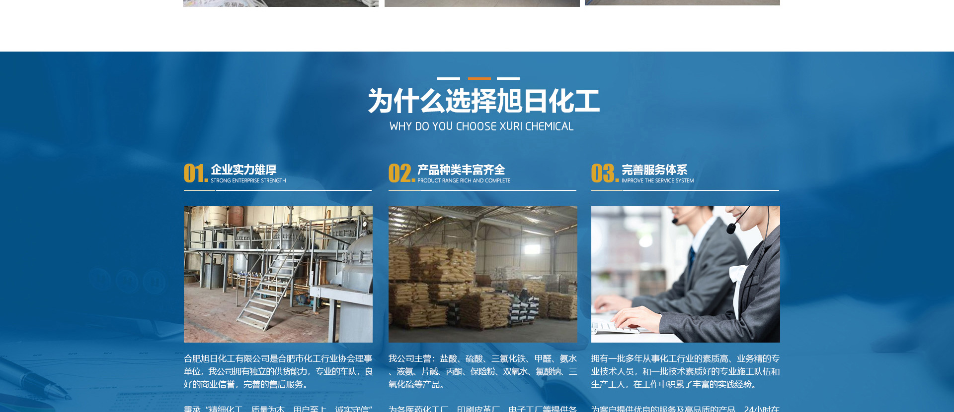 合肥旭日化工有限公司是合肥市化工行業協會理事單位,該公司擁有獨立的供貨能力,專業的車隊,良好的商業信譽,完善的售后服務。秉承“精細化工、質量為本、用戶至上、誠實守信”的企業理念。從事各類化工溶劑和原料的國內貿易;為各醫1藥化工廠、印刷皮革廠、電子工廠等提供各種化工原料配套采購。目前,公司正朝著以貿易為基礎、以實業為依托,全球采購、全國銷售,內外貿一體化,上下游一體化,具有綜合增值能力和復合競爭能力化工原料供應商。本公司主要經營的產品有:鹽酸、硫酸、三氯化鐵、甲醛、氨水、液氨、片堿等。合肥旭日化工有限公司為客戶提供優良的服務及高品質的產品,本公司經銷的各種產品不僅在安徽地區深受用戶好評,而且具有很高的市場占有率,產品行銷全國各地區。
